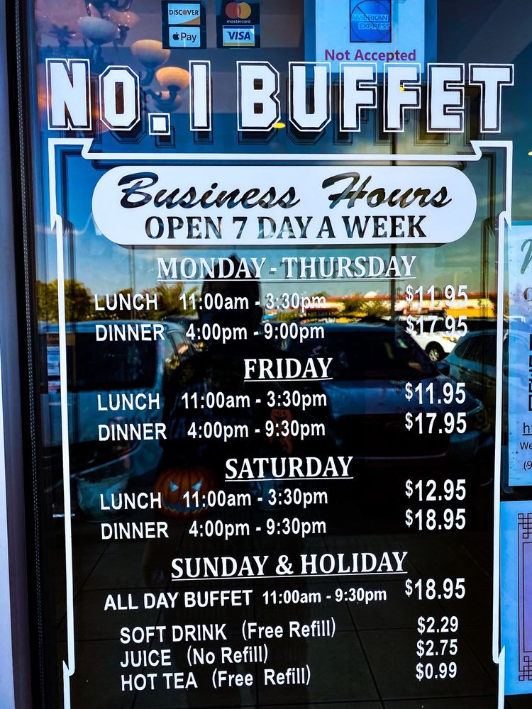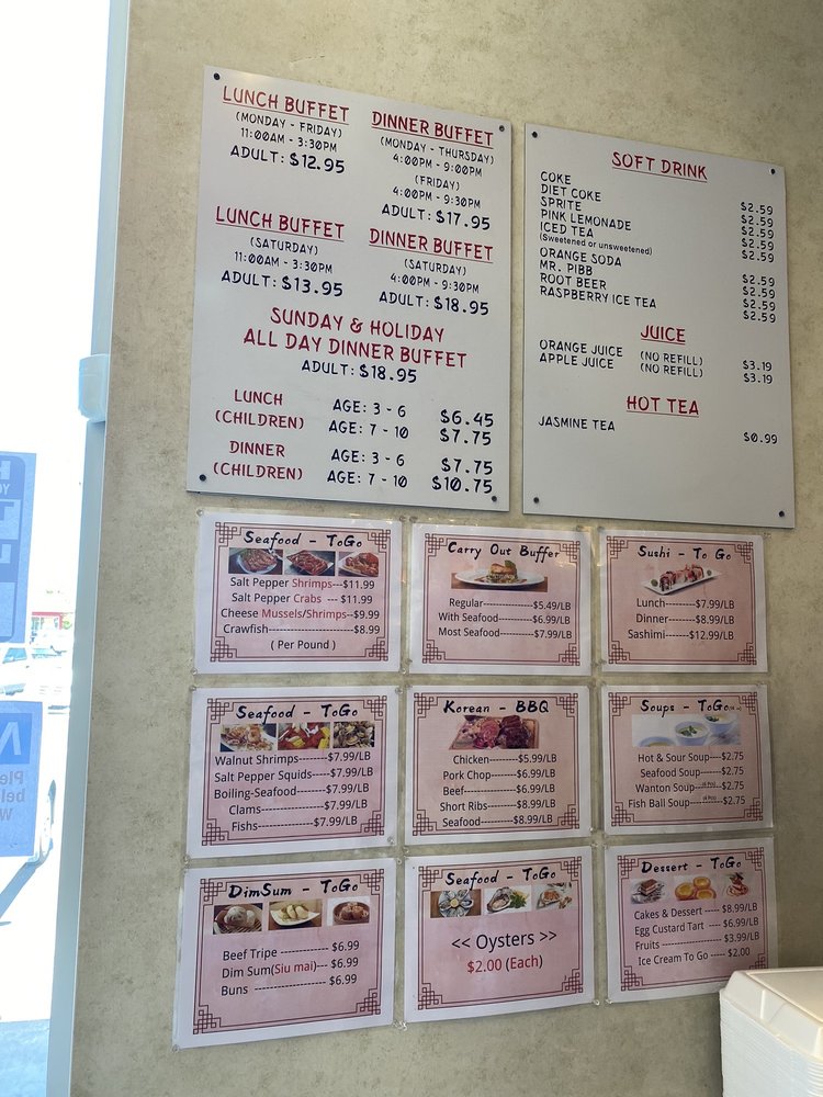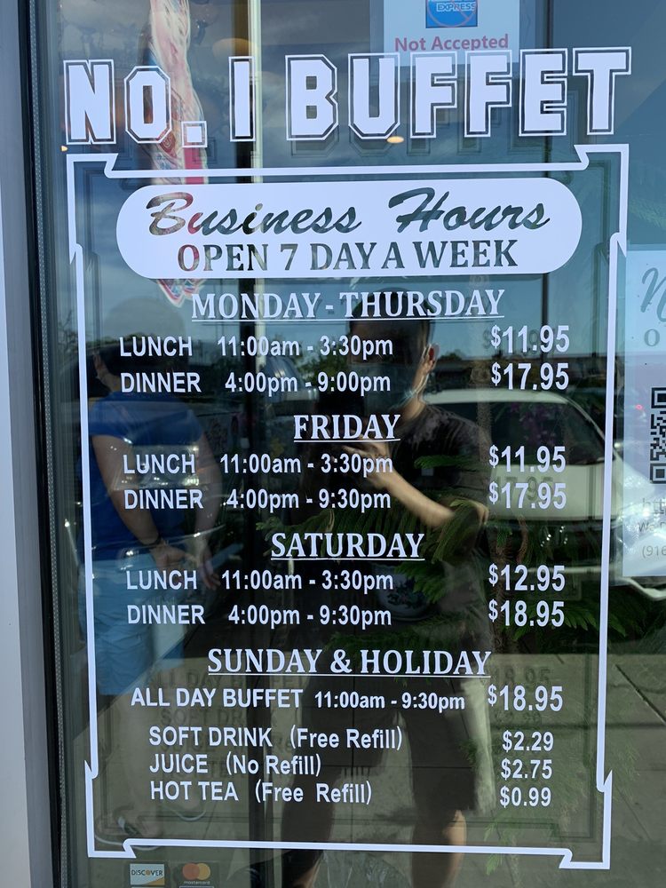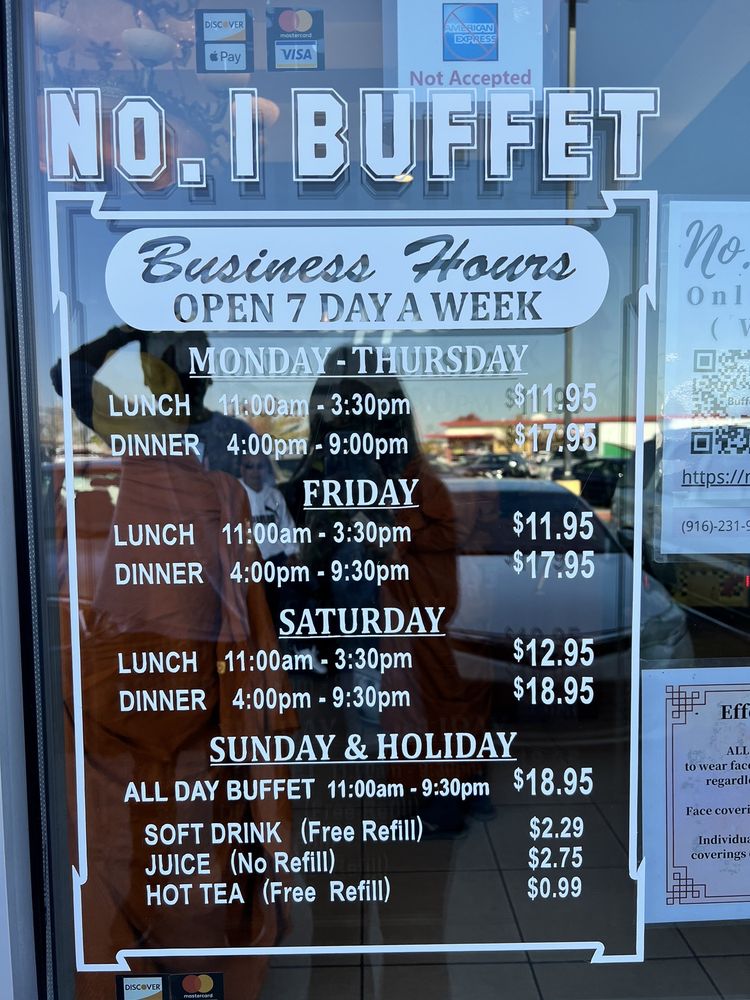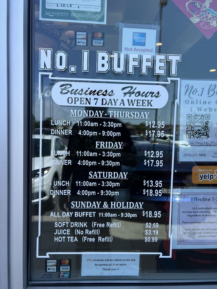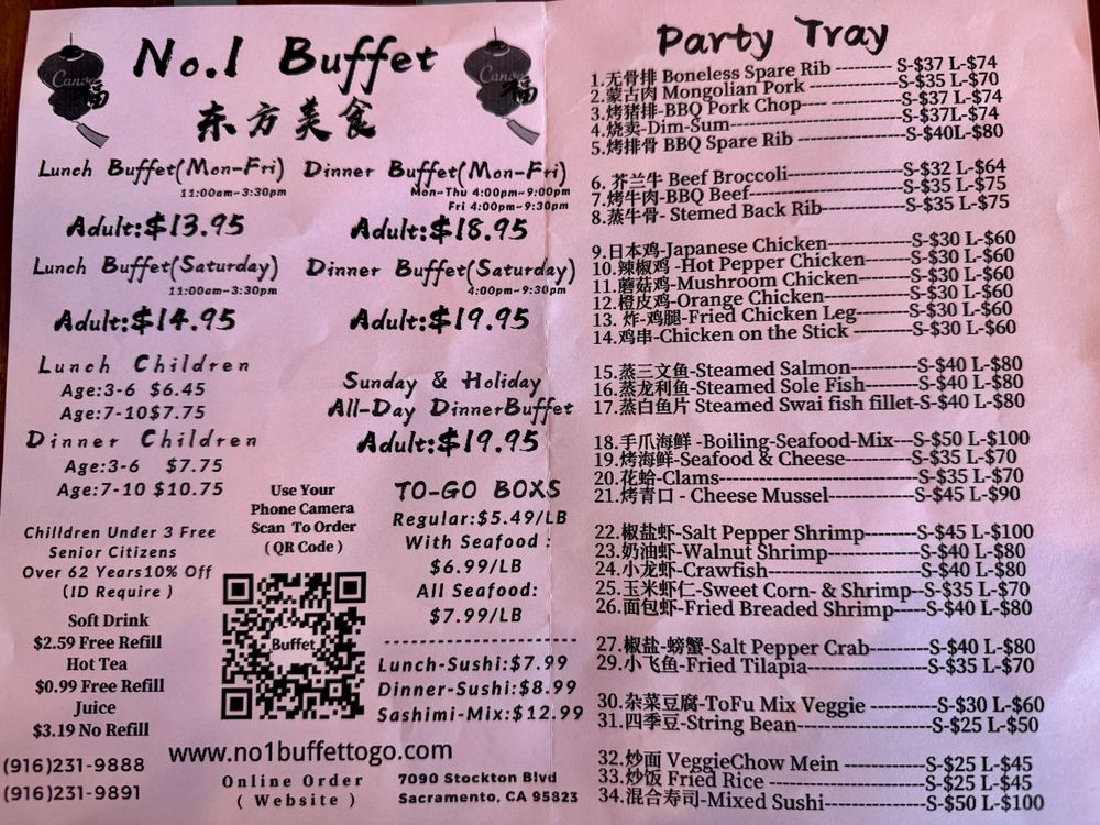 No 1 Buffet is a Chinese and Seafood buffet located in Sacramento, CA. With a variety of options like vegan and many vegetarian dishes, this buffet is perfect for groups and families. The menu offers a wide range of choices, from Mongolian and Korean barbecues to American favorites like pizza and fried chicken. Customers rave about the fresh sushi, sashimi, and seafood options, as well as the dessert bar with cakes and cookies. The lunch menu is reasonably priced, with a senior discount available. The restaurant is clean and well-maintained, with attentive waitstaff and a comfortable atmosphere. Overall, No 1 Buffet is a must-try for those looking for a diverse and delicious buffet experience.